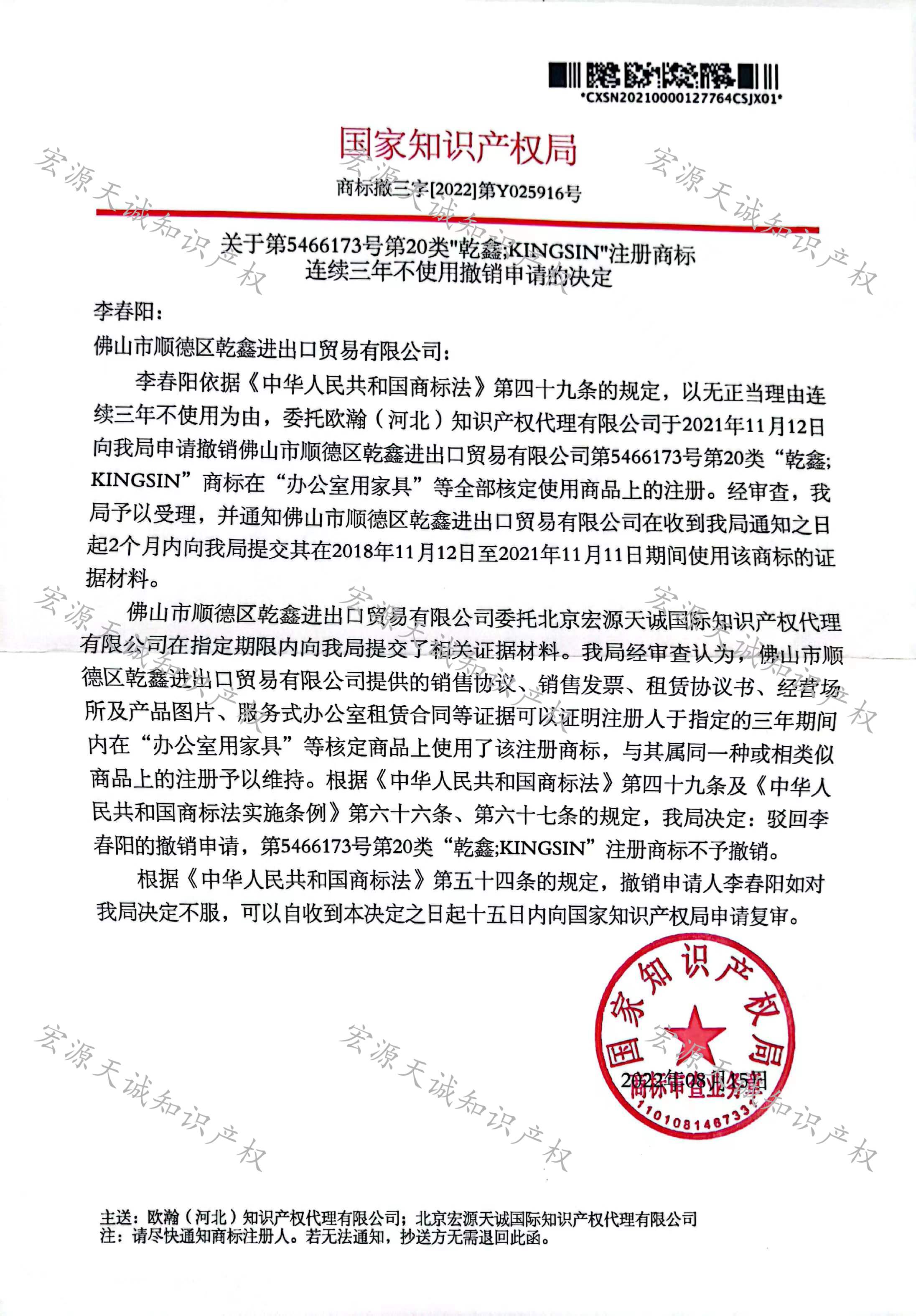宏源天诚代理“ 乾鑫;KINGSIN”商标撤三答辩成功