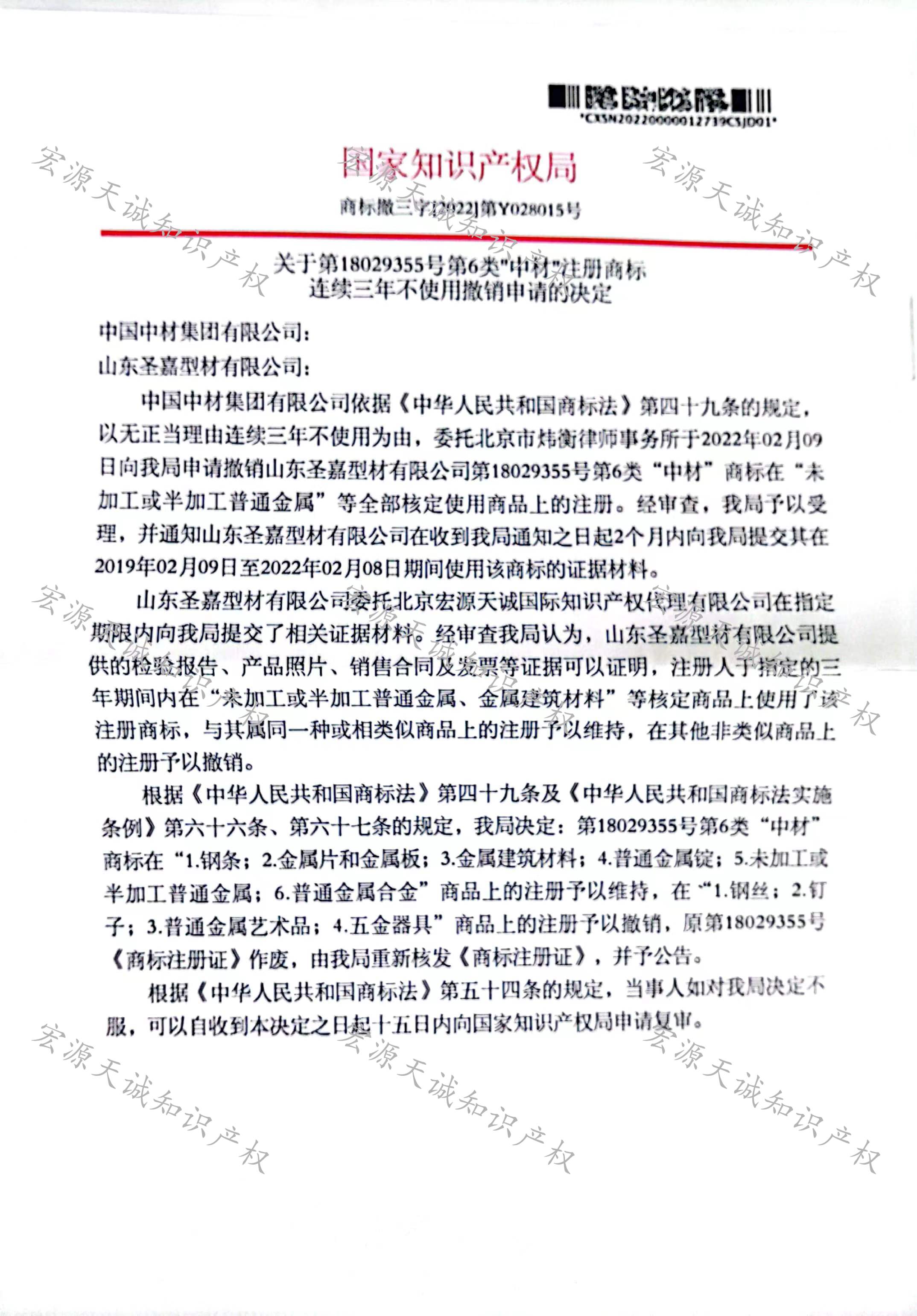 宏源天诚代理“ 中材”商标撤三答辩成功