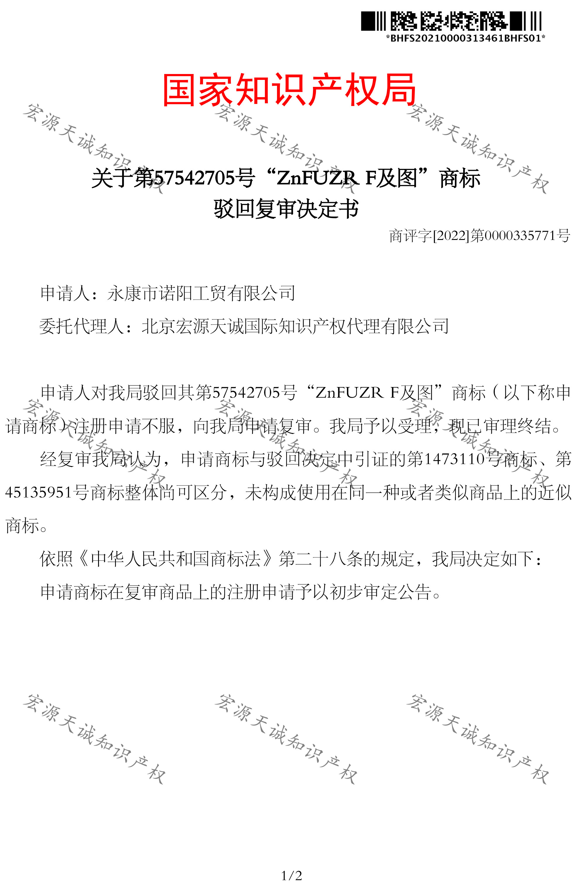 宏源天诚代理“ZnFUZR F及图 ”商标驳回复审成功