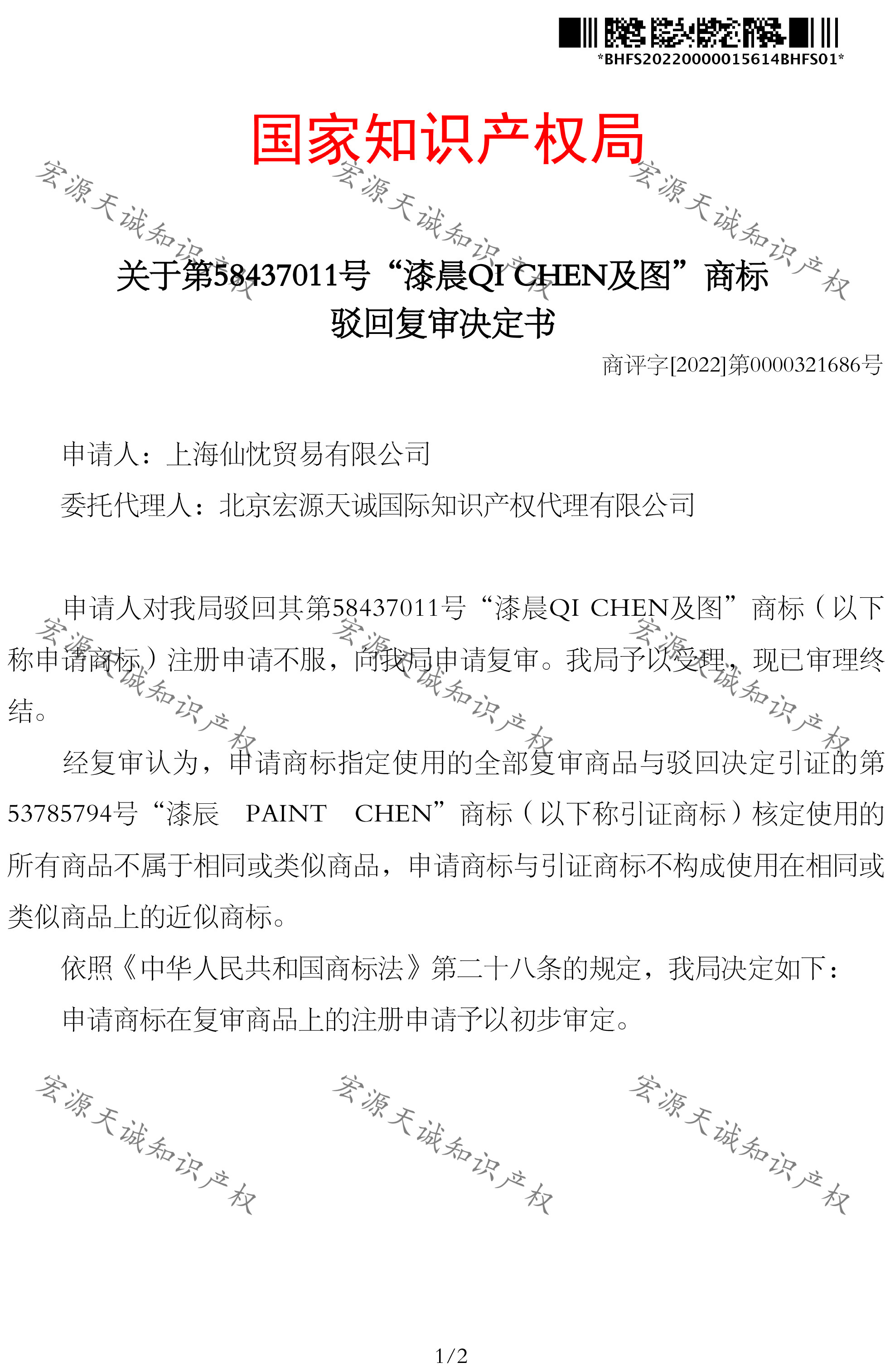 宏源天诚代理“漆晨QI CHEN及图 ”商标驳回复审成功