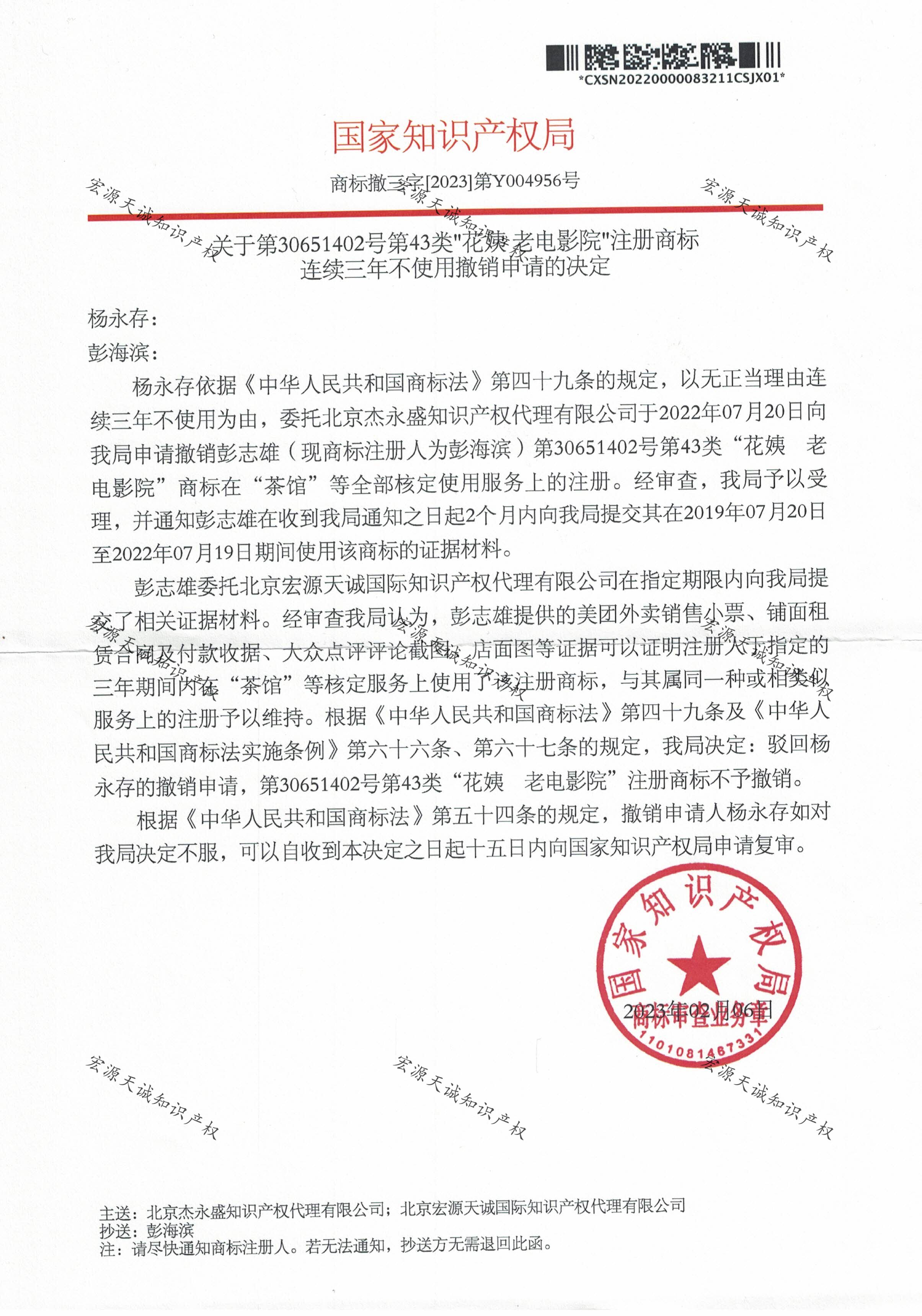 宏源天诚代理“花姨 老电影院 ”商标撤三答辩成功