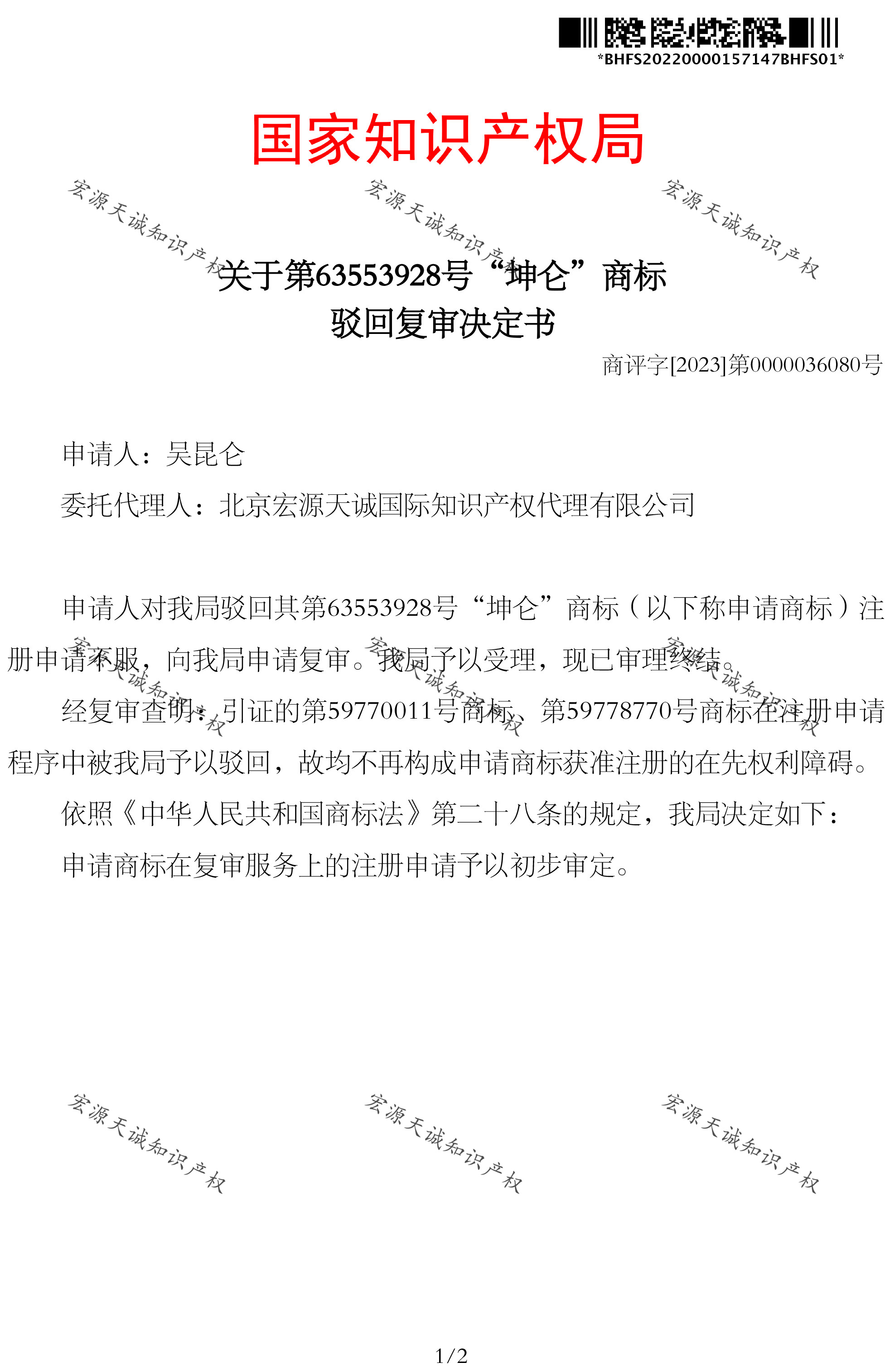 宏源天诚代理“坤仑 ”商标驳回复审成功