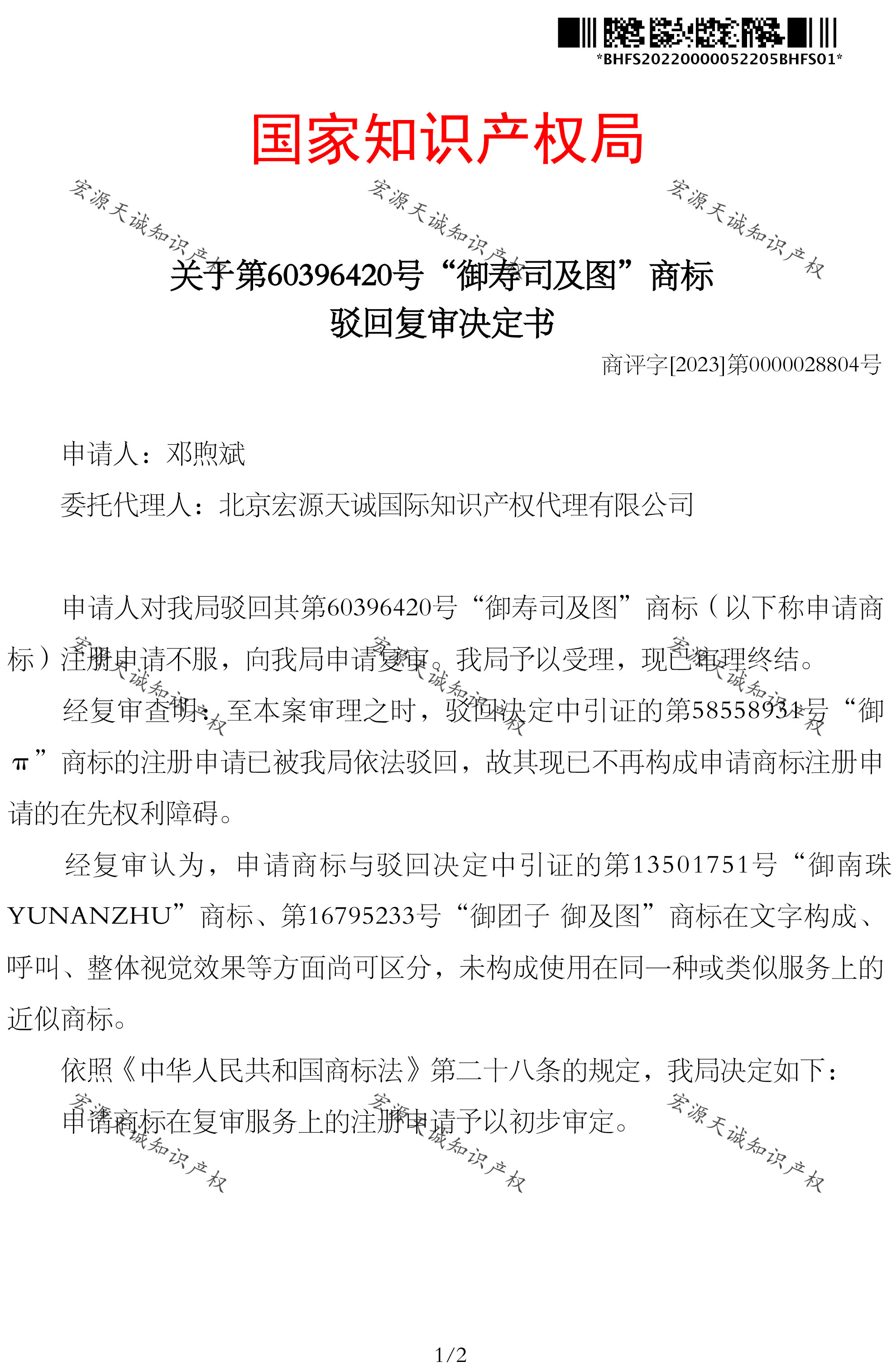 宏源天诚代理“御寿司及图 ”商标驳回复审成功