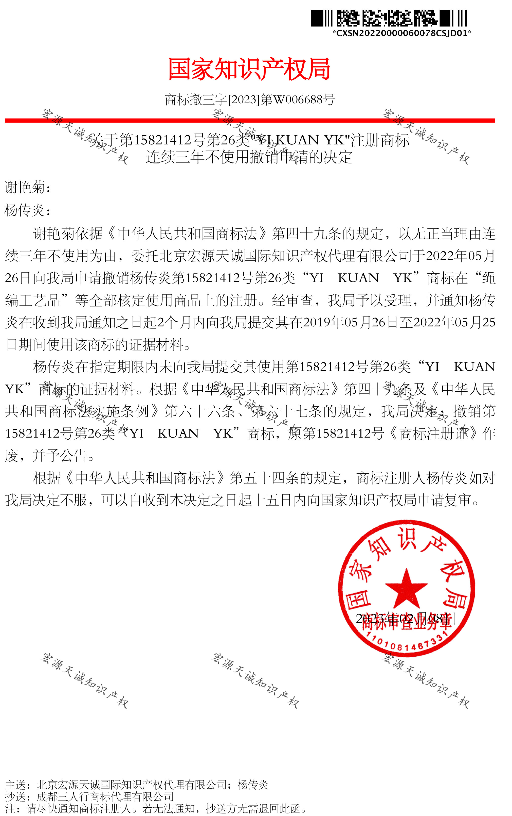 宏源天诚代理“YIKUANYK”商标提撤三成功