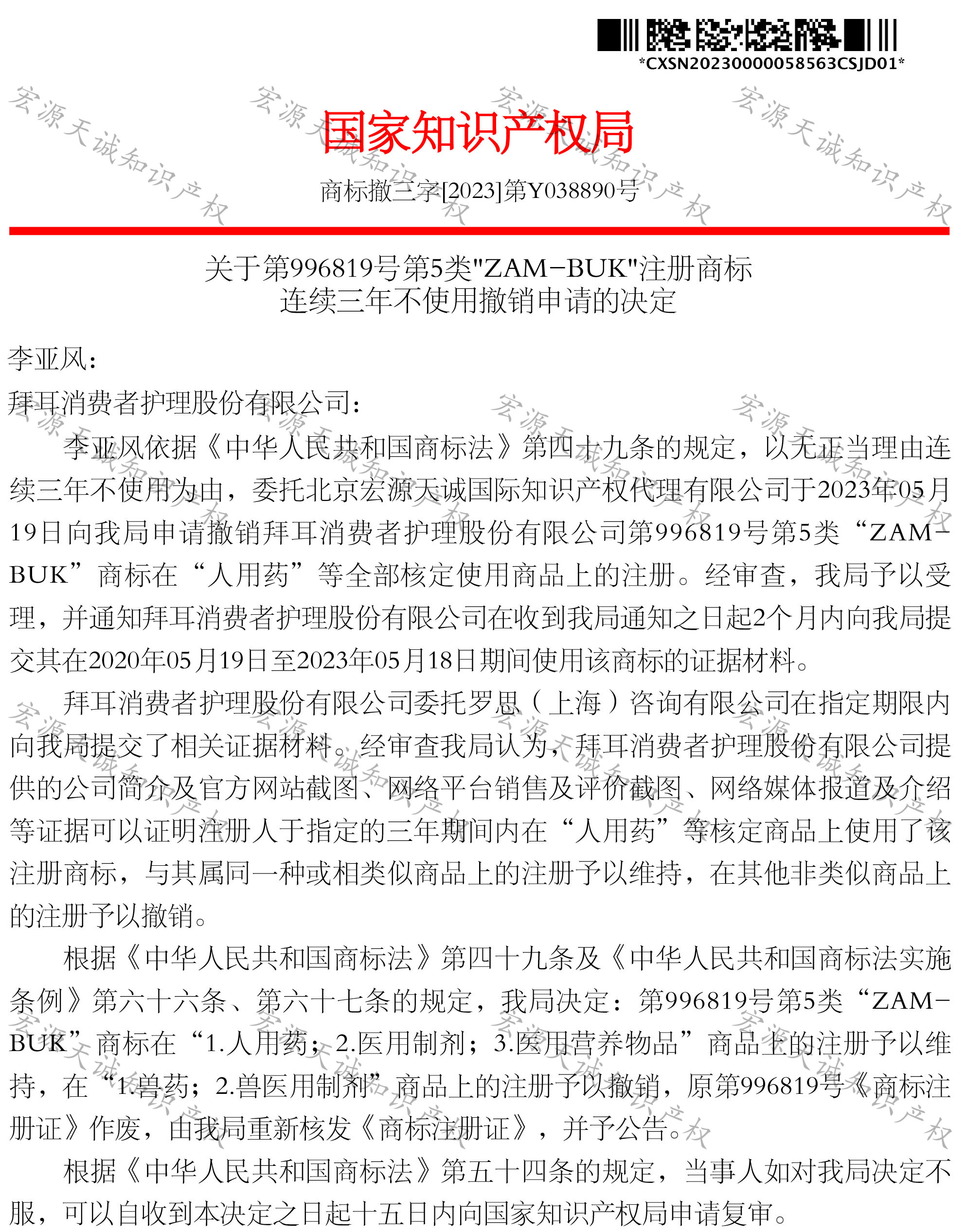 宏源天诚代理“ZAM-BUK”商标提撤三成功