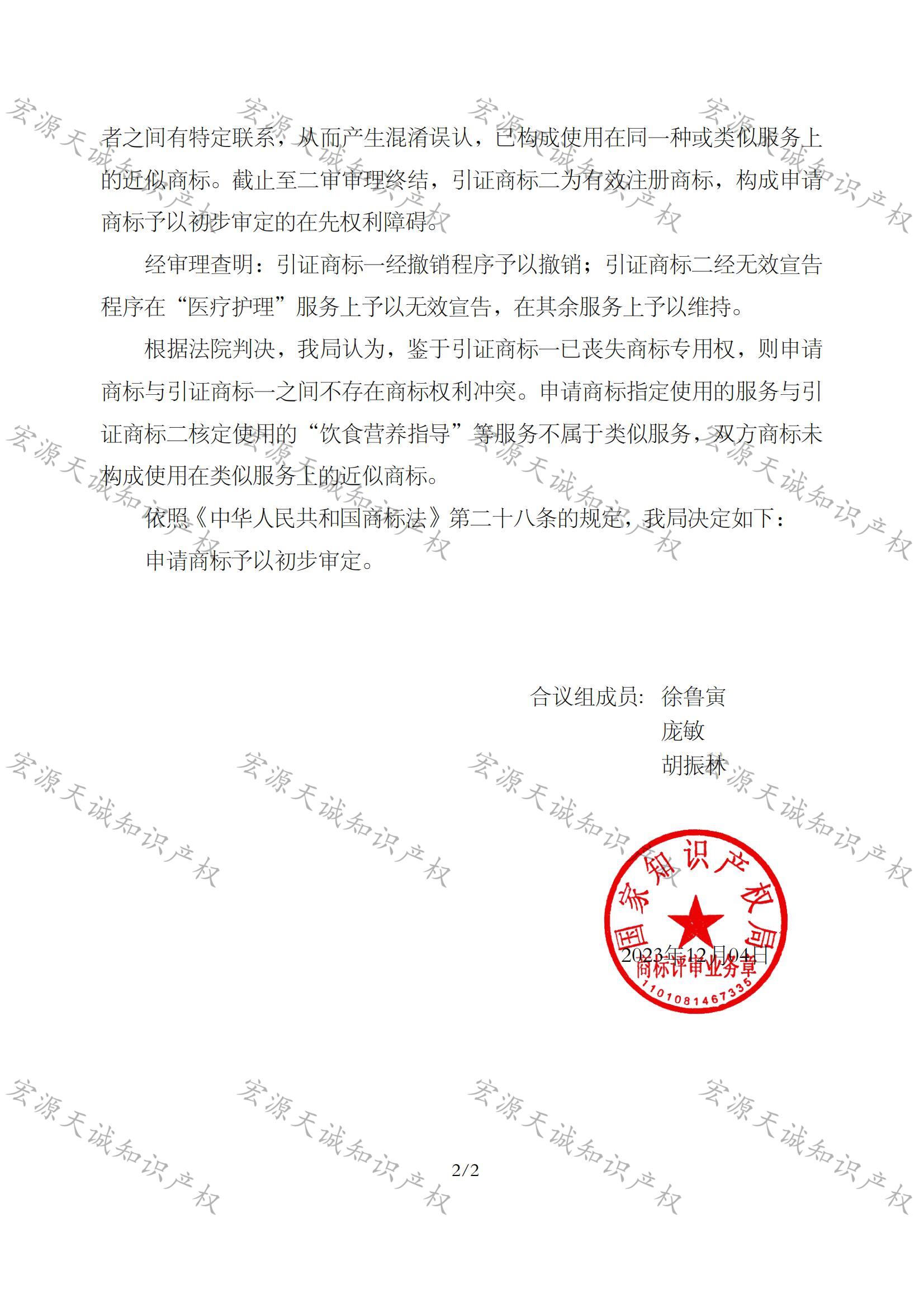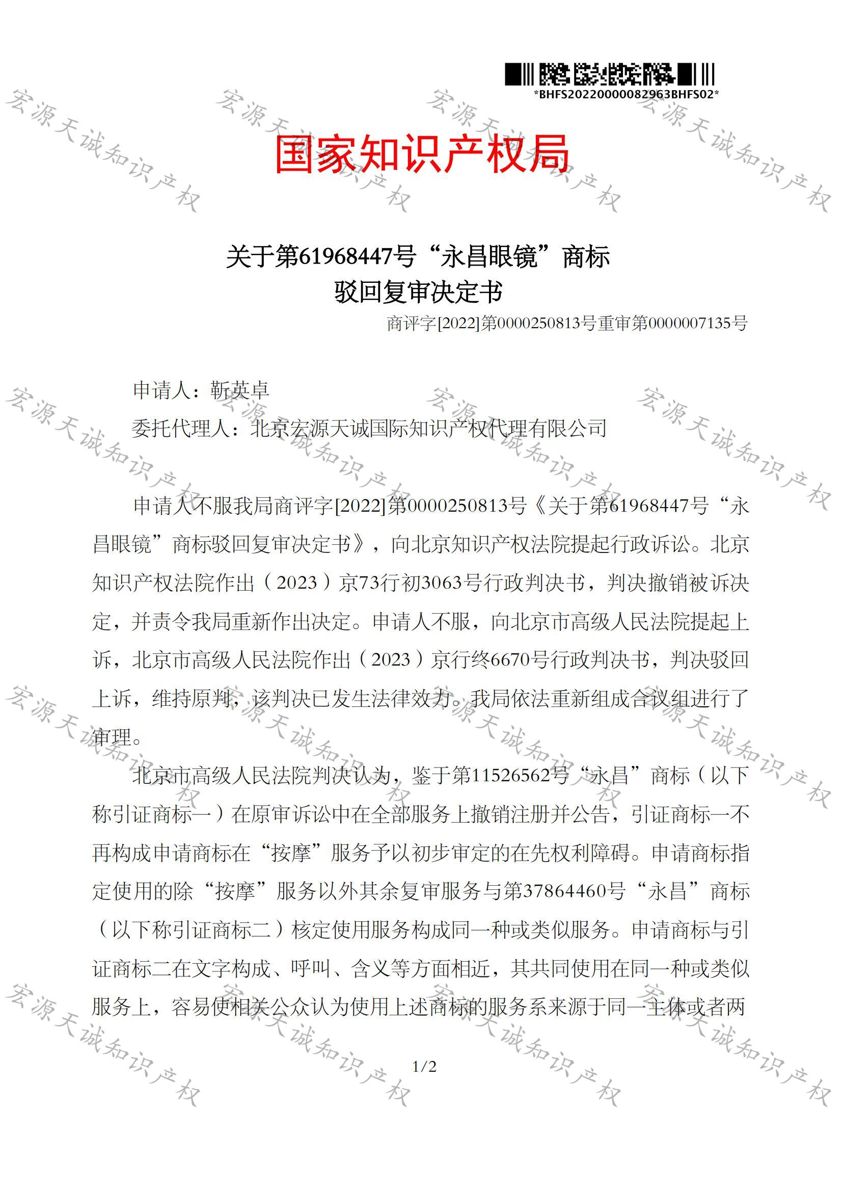 宏源天诚代理“永昌眼镜”驳回复审成功