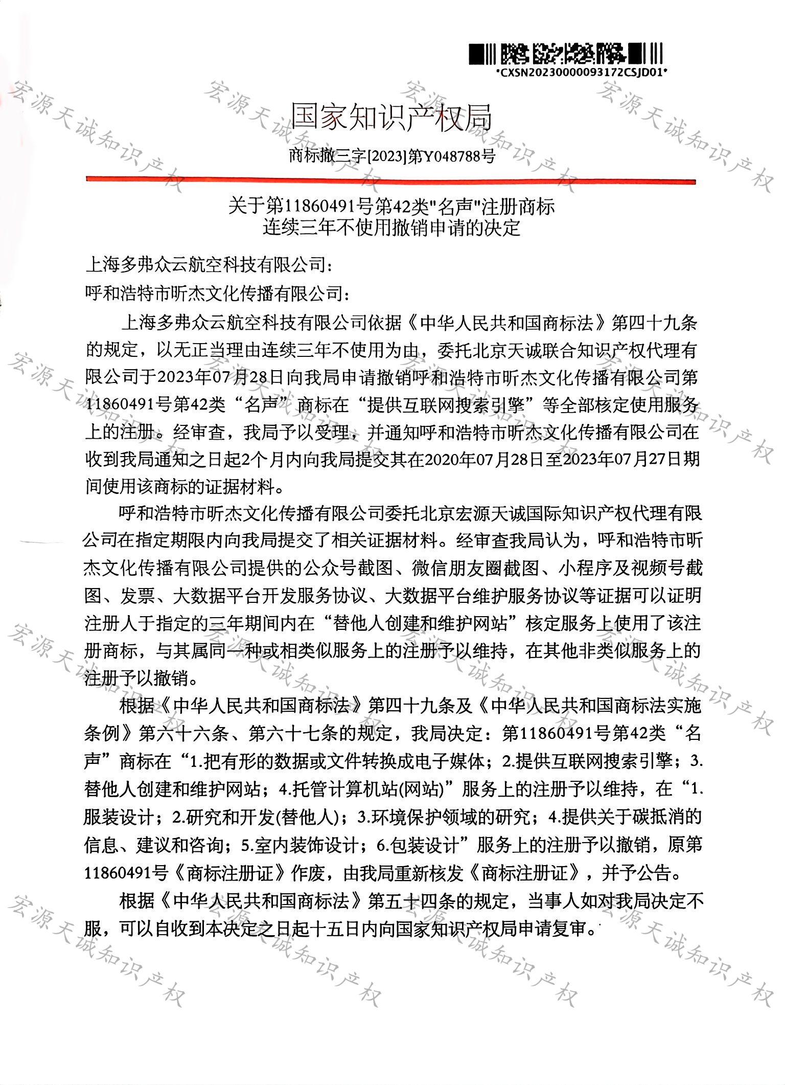 宏源天诚代理“名声”商标撤三答辩成功
