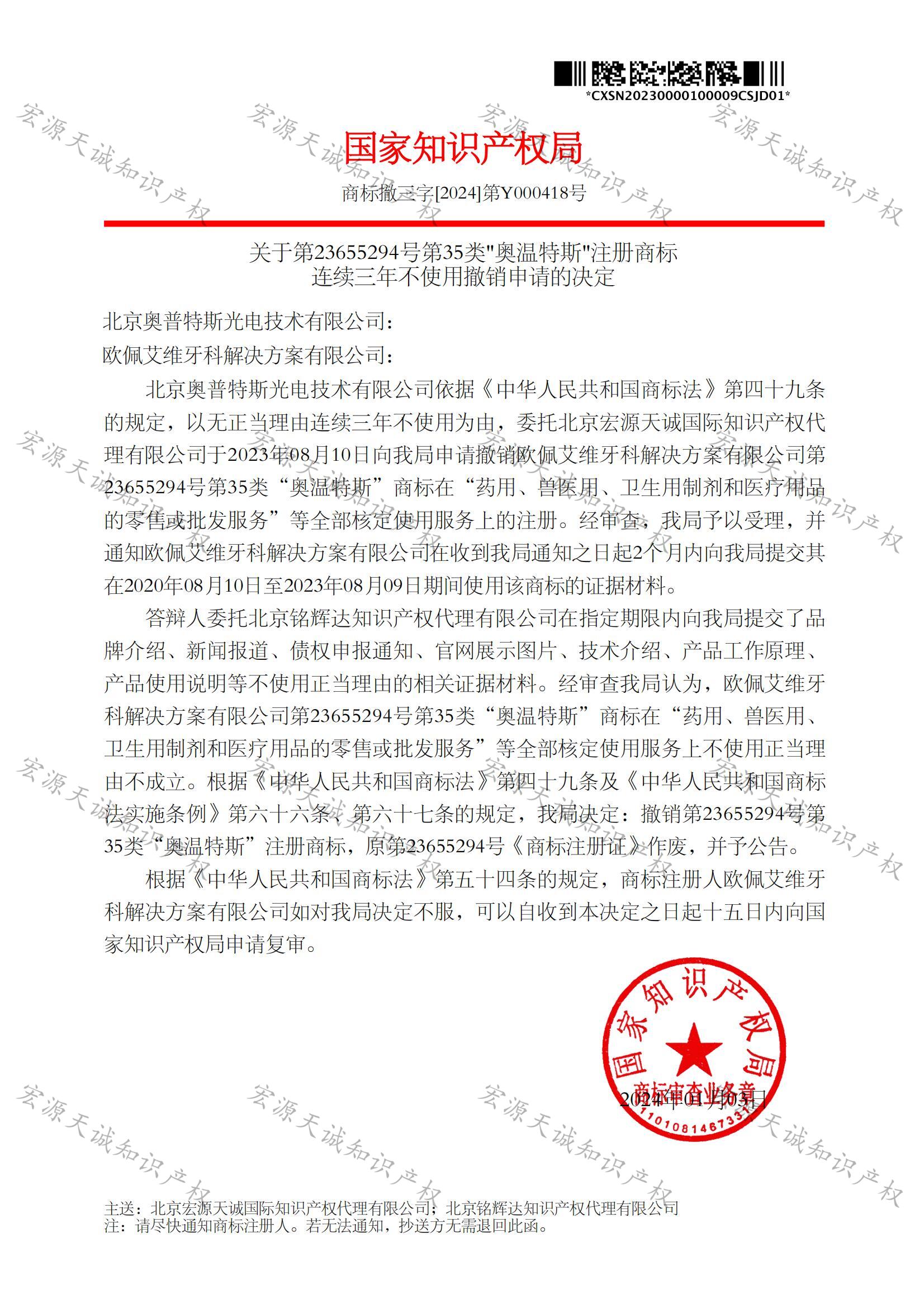 宏源天诚代理“奥温特斯”商标提撤三成功