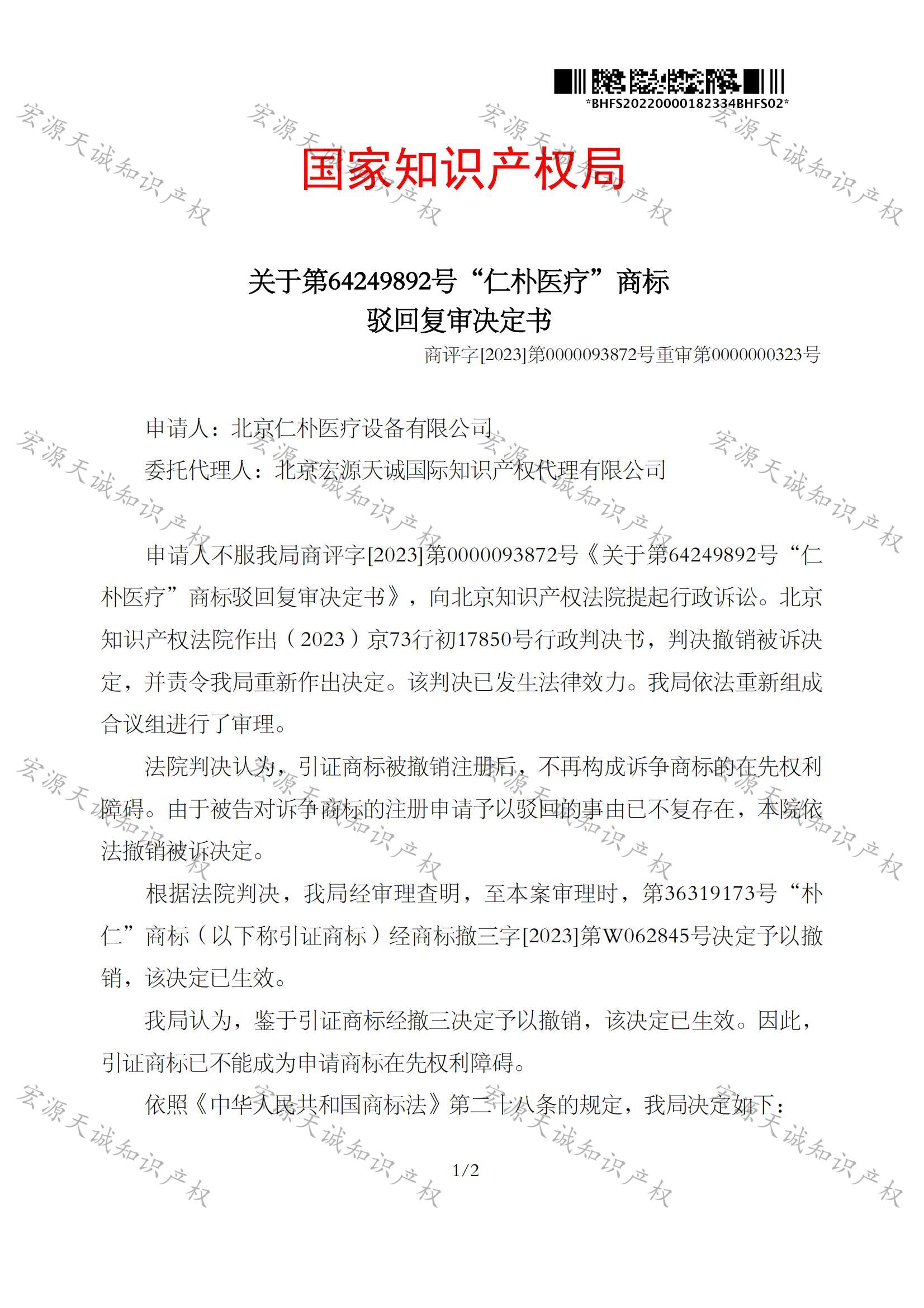 宏源天诚代理“仁朴医疗”商标驳回复审成功