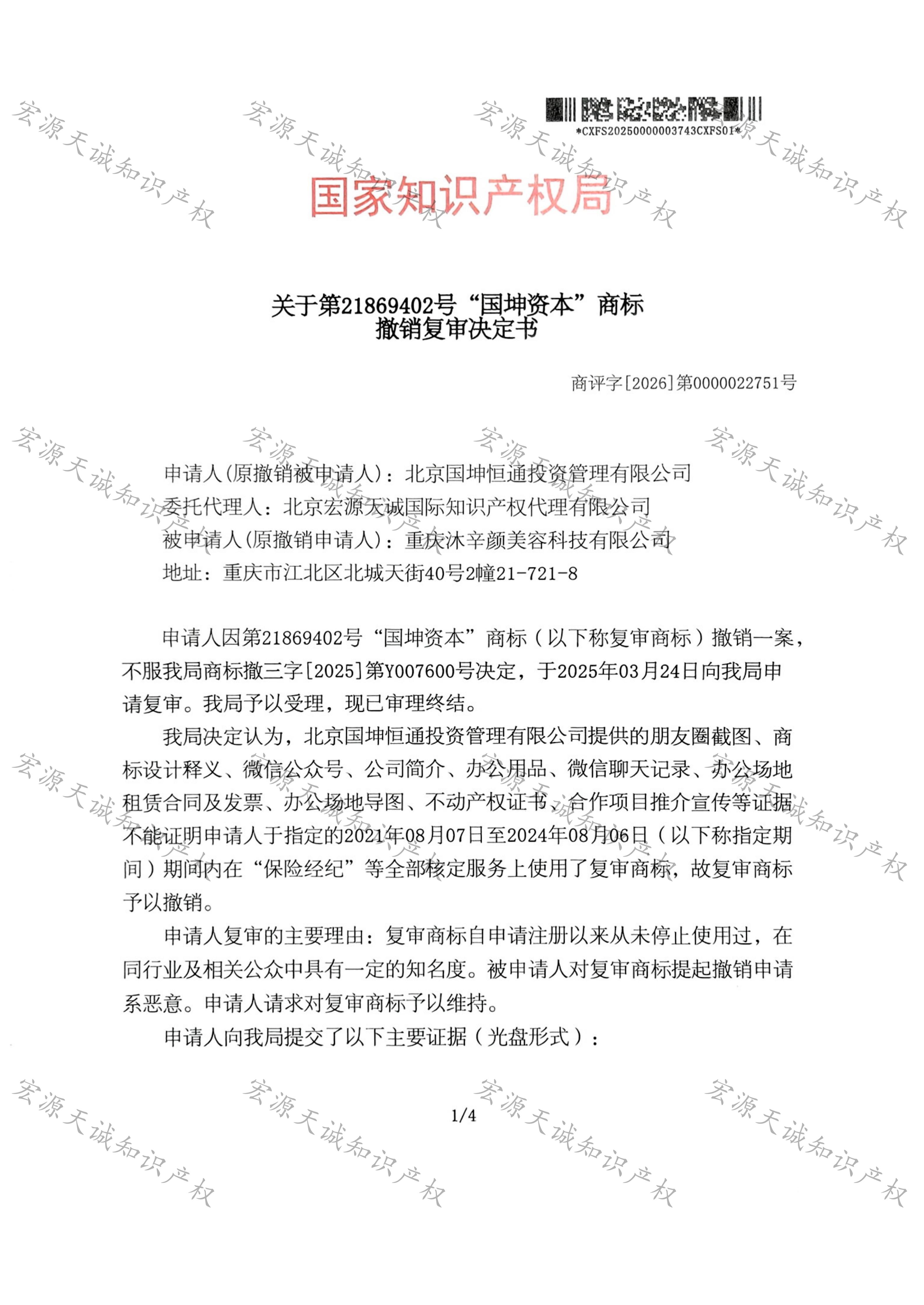 宏源天诚代理“国坤资本”商标撤销复审成功